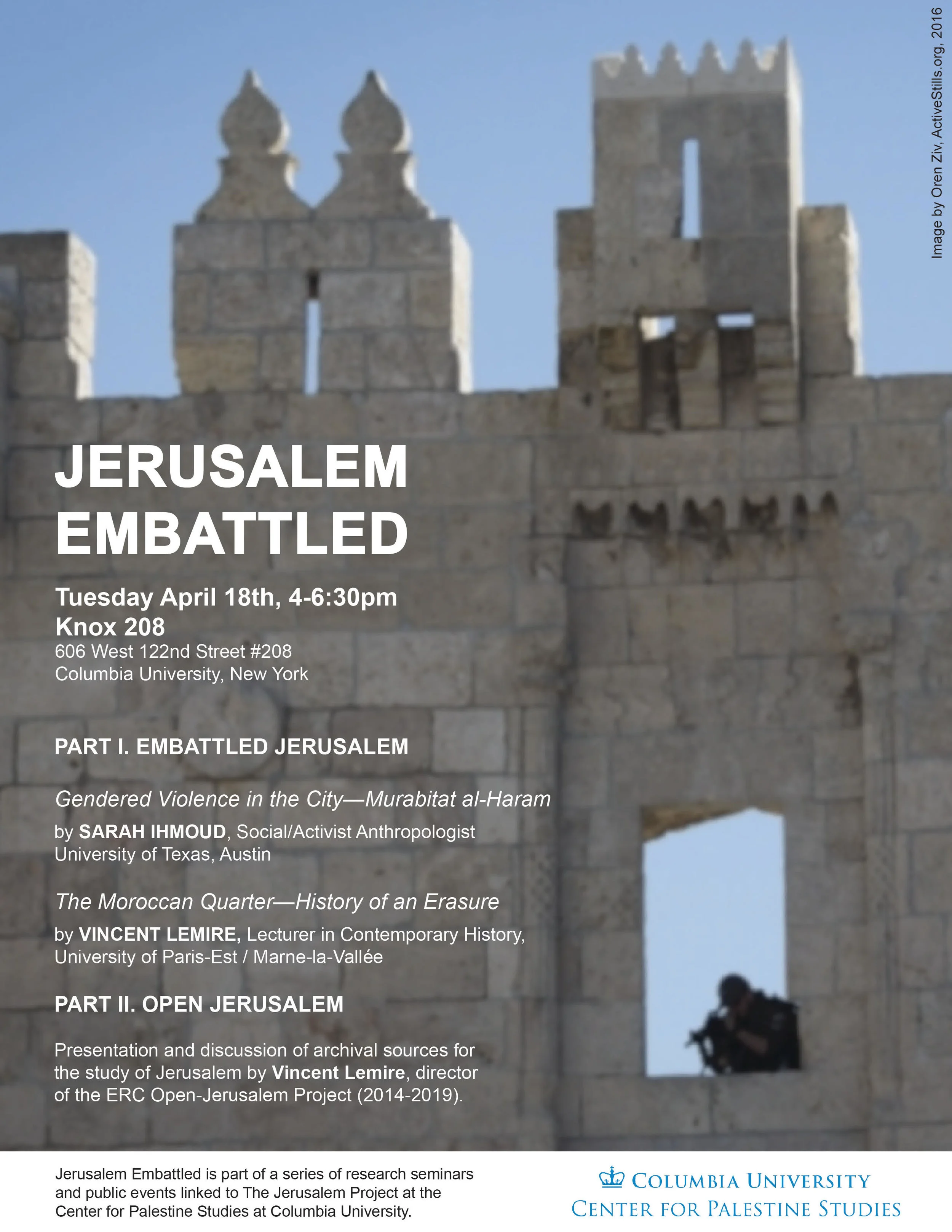 "Jerusalem Embattled" is part of a series of research seminars and public events linked to "The Jerusalem Project” at the Center for Palestine Studies at Columbia University.