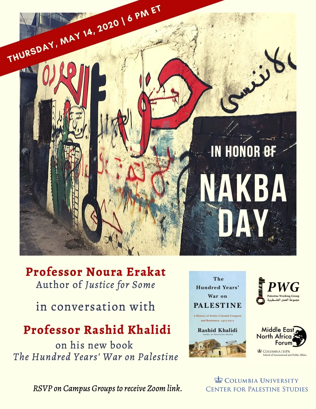 Join the SIPA Palestine Working Group, SIPA MENA Forum and the Center for Palestine Studies to hear human rights attorney and Assistant Professor Noura Erakat in conversation with Professor Rashid Khalidi. Erakat and Khalidi will discuss Khalidi's recent book, "The Hundred Years' War on Palestine: A History of Settler Colonialism and Resistance, 1917–2017." As Friday, May 15, is the 72nd anniversary of the Nakba and because Khalidi's book offers important context to the event, this conversation will offer a chance for reflections on the Nakba.
