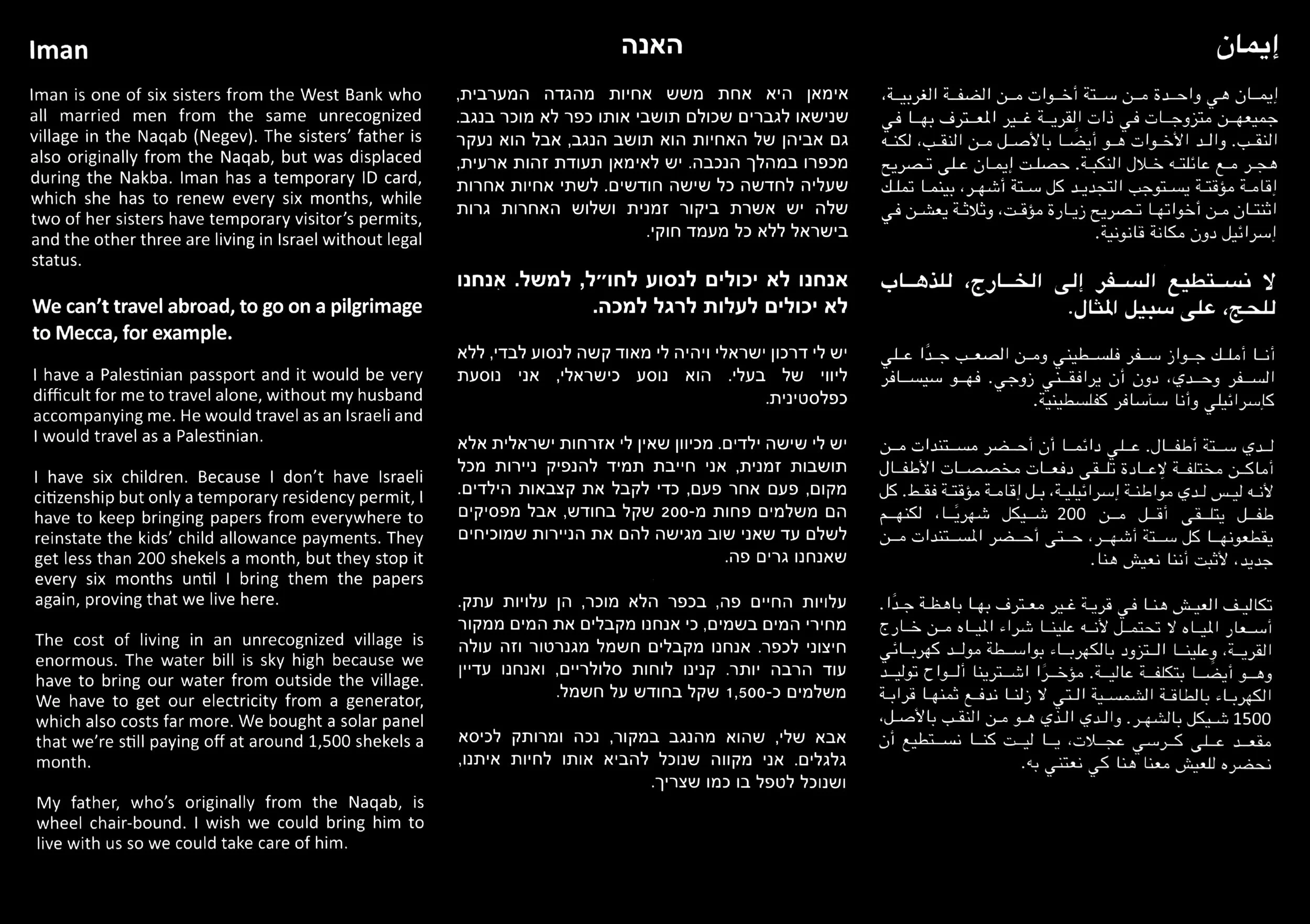 January 27, 2017 Palestine Studies Iman January 27, 2017 Palestine Studies View fullsize View fullsize Featured Iman "The cost of living in an unrecognized village is enormous. The water bill is sky high because we have to bring our water from outside the village" Iman "We can't travel abroad or go on a pilgrimage to Mecca, for example." Palestine Studies
