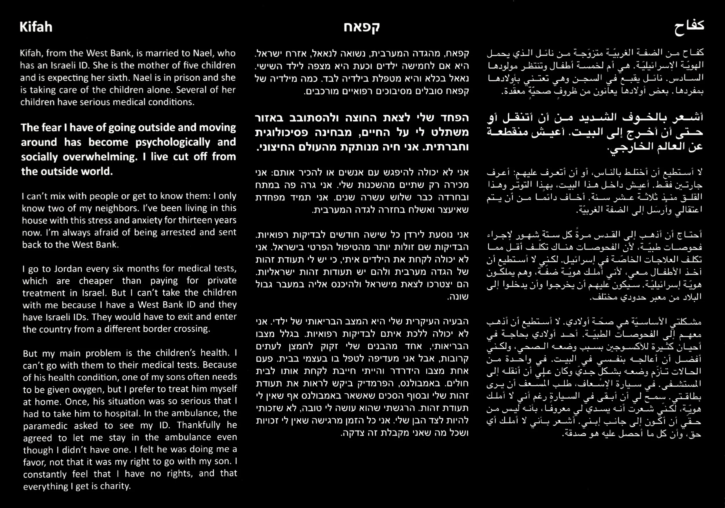 January 27, 2017 Palestine Studies Kifah January 27, 2017 Palestine Studies View fullsize View fullsize Featured Kifah "I constantly feel that I have no rights, and that everything I get is charity." Kifah "The fear I have of going outside and moving around has become psychologically and socially overwhelming. I live cut off from the outside world." Palestine Studies