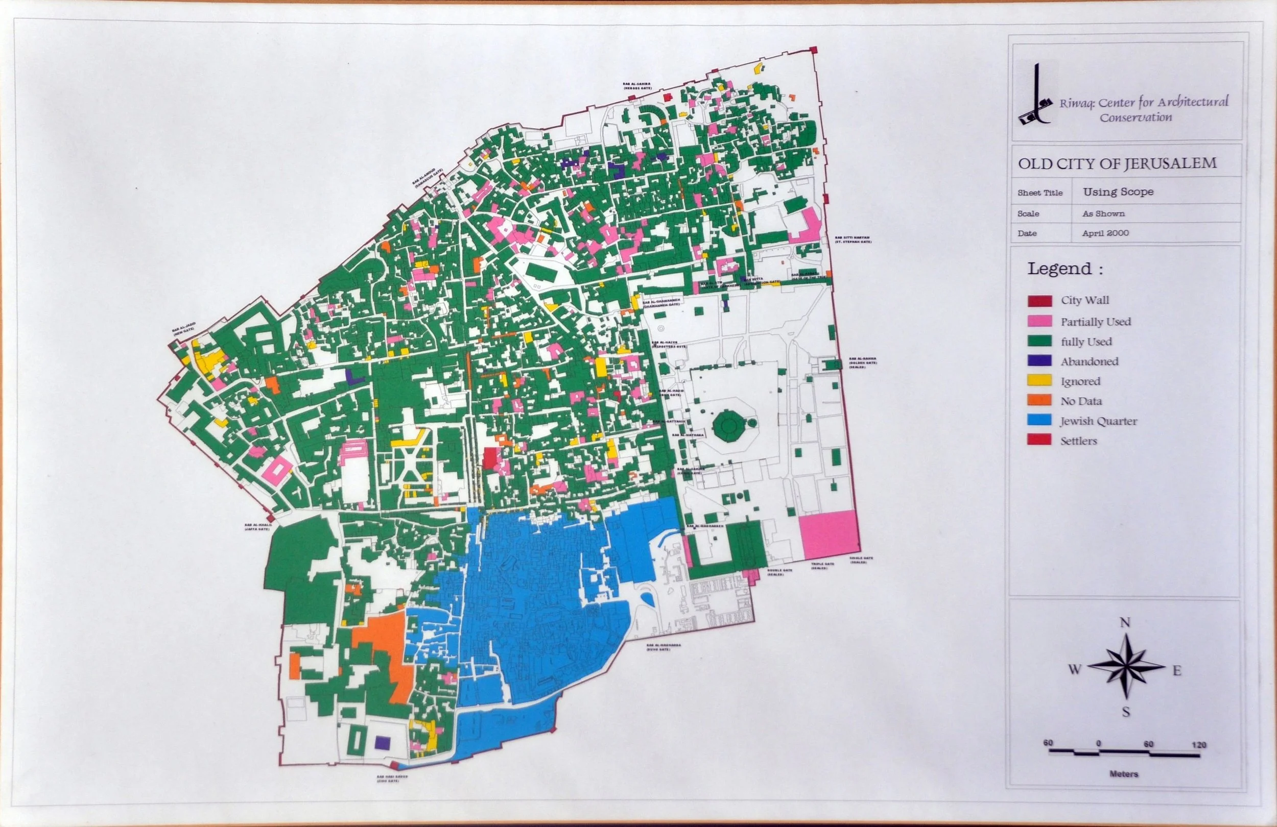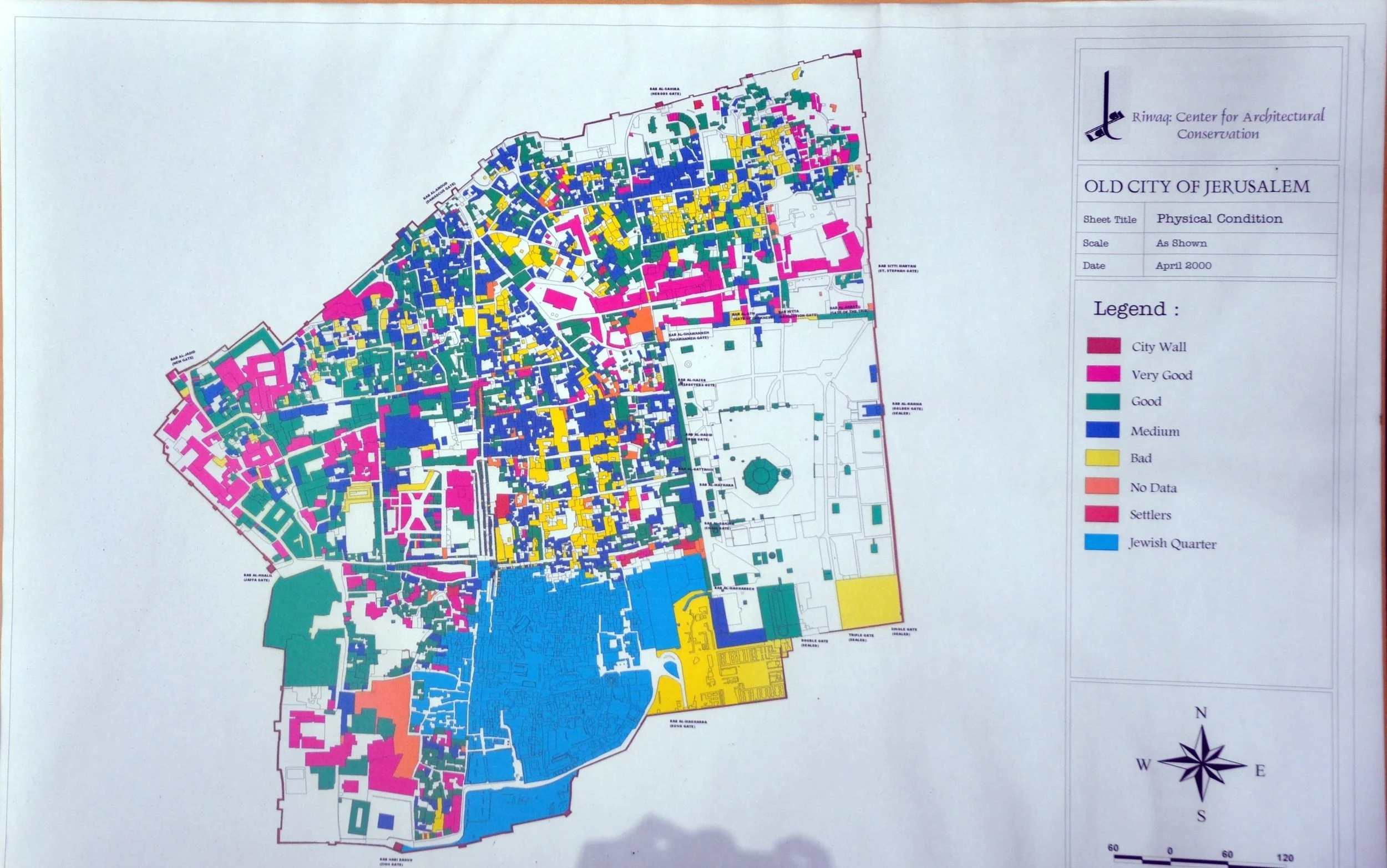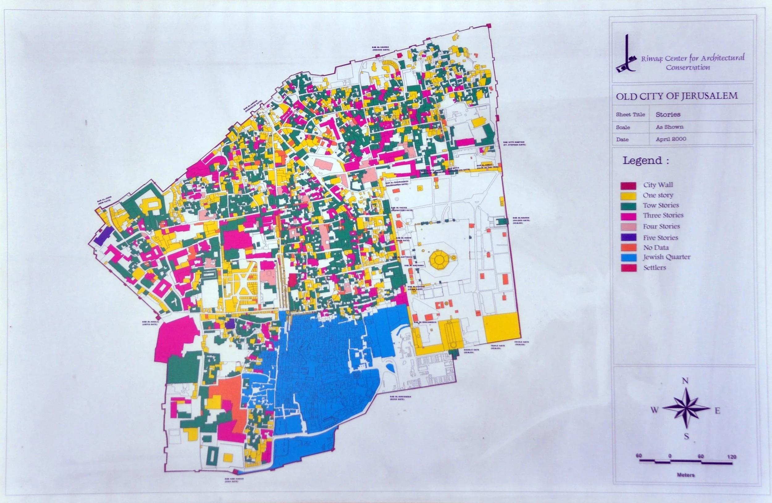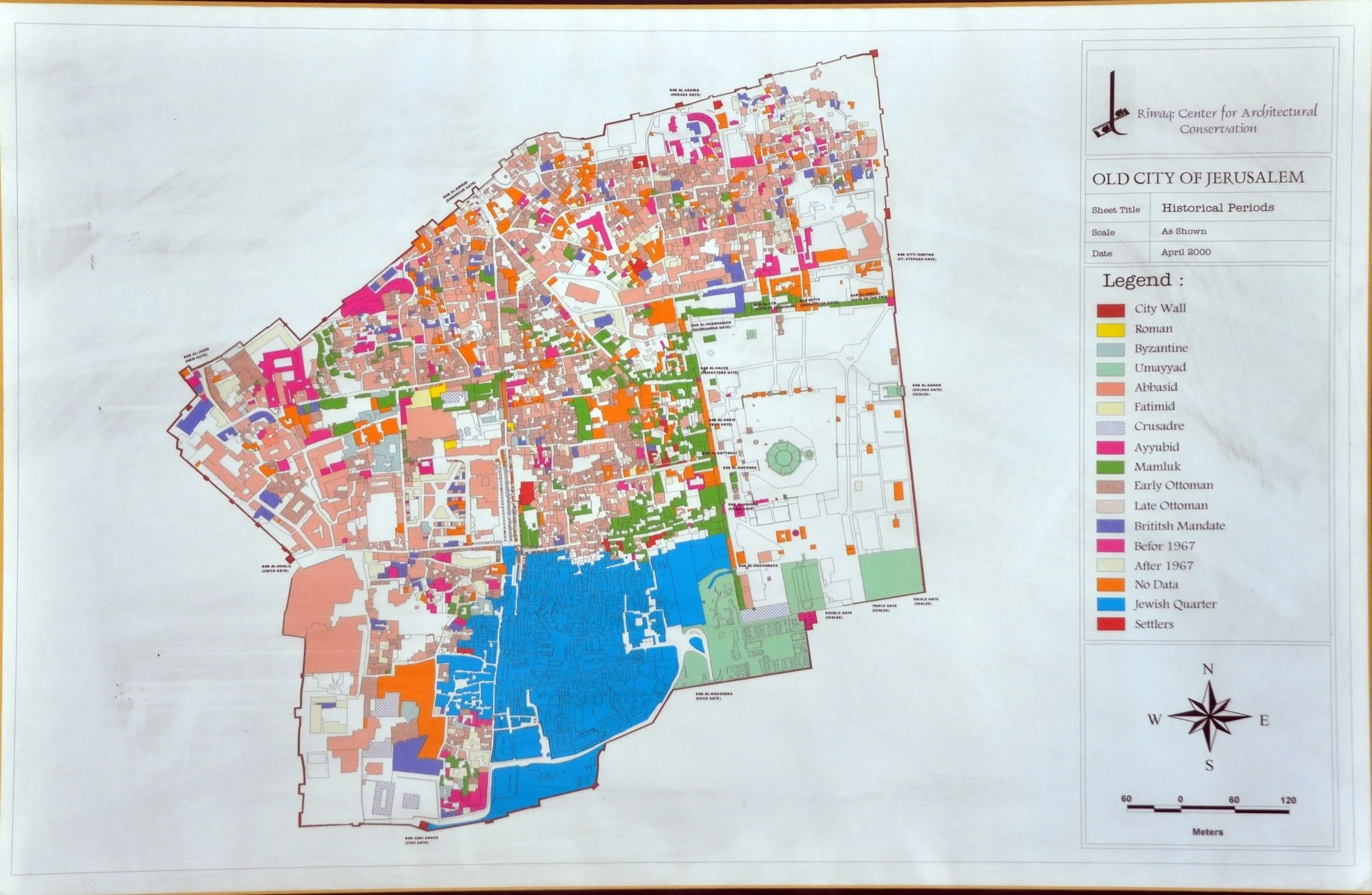 Riwaq’s Jerusalem Maps: The current stock that opens the collection contains five maps based on a ten-year survey of the old city undertaken by Riwaq: The Centre for Architectural Conservation. It contains a historical map identifying the evolution of sites according to the historic era (Roman, Byzantine, Umayyad, Fatimid, Ottoman, etc.), as well as markers identifying the condition, nature, size of buildings and residency in the walled city. Those maps can be downloaded and used by researchers provided source reference is identified. (Copyright Riwaq: Bireh, Palestine)—Higher resolution images are available from the Centre directly.