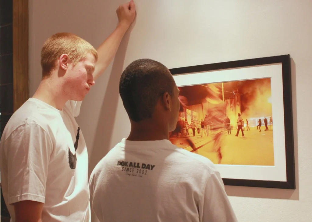 Inside, our guest on November 6, 2013, was a Palestinian photographer from Aida Refugee Camp, in the Israeli-occupied West Bank. His name is Mohammad Al-Azza, the same man whose bloodied image hung on the wall outside. He is the director of the media unit at Lajee Center, a youth organization where he teaches photography and documentary filmmaking to young Palestinian refugees. At 23 years old, Al-Azza was barely older than the undergraduate students in the audience that evening...